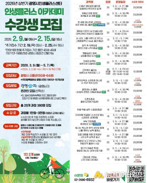 광명시 인생플러스센터는 신중년의 인생 2막 탐색과 준비를 지원하는 ‘2026년 상반기 인생플러스 아카데미’ 수강생 380명을 오는 9일부터 선착순 모집한다.