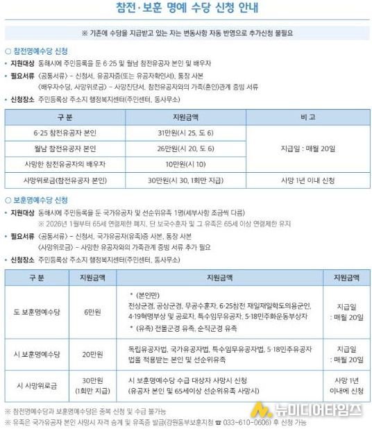 또한 보훈명예수당의 경우 보국수훈자 및 그 유족을 제외하고 적용되던 기존 65세 이상의 연령 제한을 2026년 1월부터 폐지해 보다 폭넓은 지원이 이뤄질 수 있도록 했다.