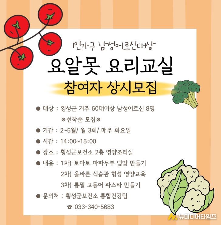 횡성군은 1인가구 남성 어르신의 건강한 식생활 형성과 영양관리 강화를 위해 2월부터 5월까지 “요알못(요리를 알지 못하는) 영양교실”을 운영한다.
