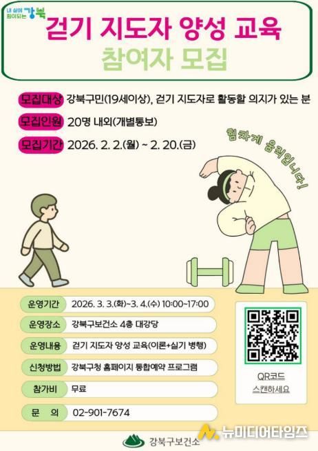 모집 대상은 걷기 지도자로 활동할 의지가 있는 만 19세 이상 강북구민이며, 모집 인원은 20명 내외이다. 신청은 2월 20일까지 강북구청 홈페이지 통합예약 시스템을 통해 가능하다.