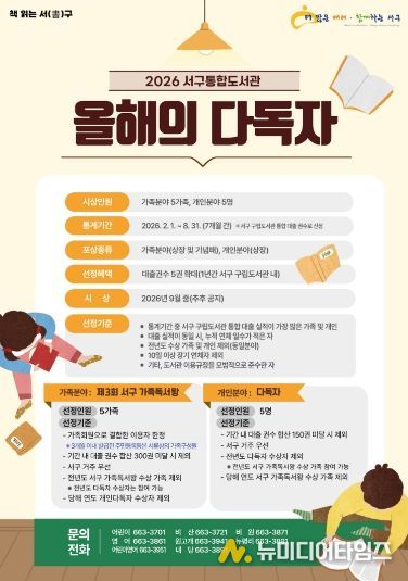 선정된 개인 다독자 5명과 다독 가족 5가정에는 ‘2026년 제5회 북&평생학습 축제’ 행사 시 상장이 수여될 예정이며, 선발 이후 1년간 도서 대출 권수 확대 혜택이 제공된다.