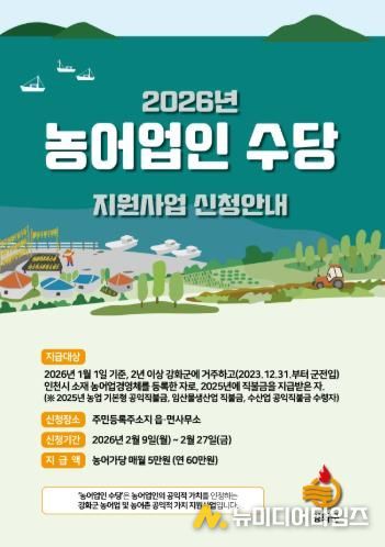 강화군은 2026년 농어업인 수당 지급 신청을 2월 9일부터 2월 27일까지 주소지 읍·면사무소에서 접수한다.