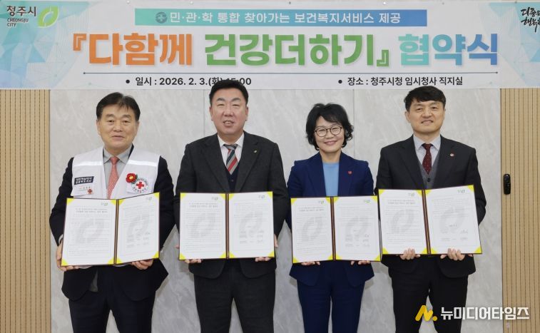 이날 임시청사 직지실에서 열린 협약식에는 이범석 청주시장, 장현봉 대한적십자사 충북지사회장, 박애순 국민건강보험공단 청주동부지사장, 최준영 국민건강보험공단 청주서부지사장이 참석했다.