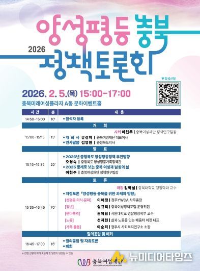 충북여성재단(대표이사 유정미)은 오는 2월 5일 오후 3시, 충북미래여성플라자 A동 문화이벤트홀에서 '2026 양성평등 충북 정책토론회'를 개최한다.