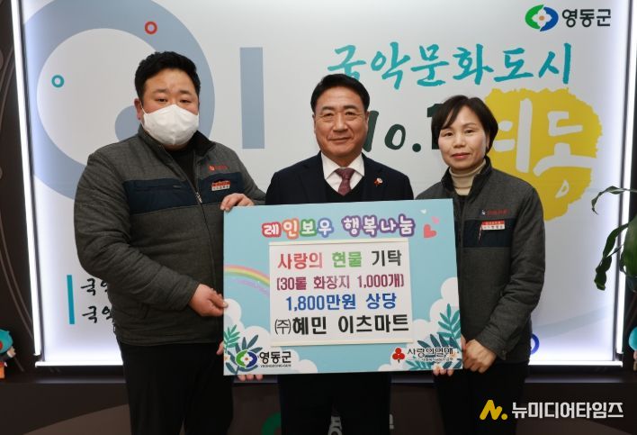 ㈜혜민 이츠마트(대표 정진흥)는 4일 영동군청을 방문해 지역 내 어려운 이웃을 돕기 위한 현물 기탁 30롤 화장지 1,000개(1,800만 원 상당)를 기탁했다.