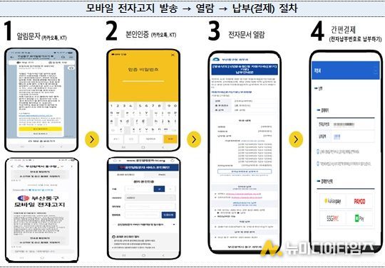 부산시는 기존 우편(종이) 송달하고 있는 지방세 관련 각종 고지·안내문을 전자문서 형태로 공인전자문서중계자(카카오, KT, SKT, LGU+) 문자 메시지로 전송하는 '모바일 전자고지 서비스'를 2월부터 본격 시행한다고 밝혔다.