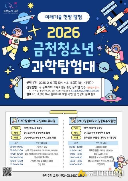 금천구는 관내 초등학생을 대상으로 미래기술 현장을 직접 체험하는 ‘2026년 금천 청소년 과학탐험대’ 프로그램을 운영한다고 밝혔다.