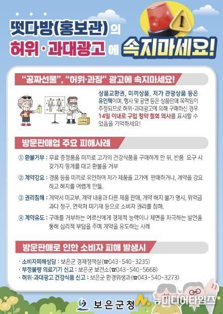 충북 보은군은 최근 방문판매업(홍보관) 운영과 관련해 노인을 중심으로 한 소비자 피해가 우려됨에 따라, 피해 예방을 위한 종합 대책을 마련하고 본격 추진에 나섰다고 4일 밝혔다.