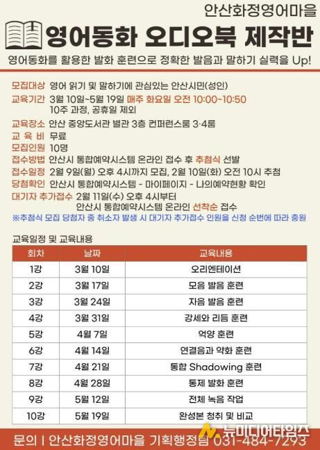 안산시가 설립하고 안산대학교가 운영하는 안산화정영어마을이 성인 영어 학습자를 위한 ‘영어동화 오디오북 제작반’을 3월부터 5월까지 10주 과정으로 안산시 중앙도서관에서 운영한다고 4일 밝혔다.