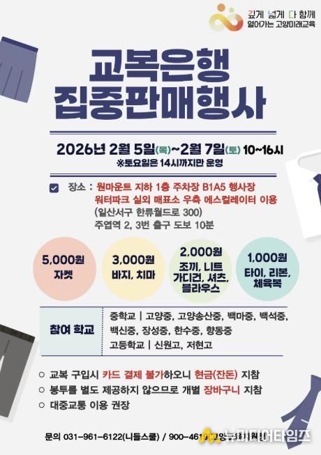 경기도고양교육지원청은 관내 중·고등학교 졸업생의 교복 물려주기 일환으로 교복은행 집중판매 행사를 2월 5일부터 7일까지 3일간 고양 원마운트에서 진행한다고 밝혔다.