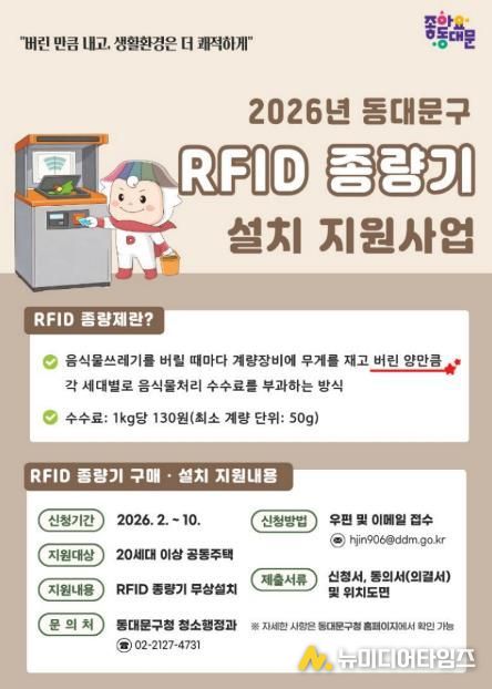 동대문구는 음식물류 폐기물을 줄이고 쾌적한 주거환경을 만들기 위해 ‘2026년 공동주택 음식물 쓰레기 RFID 종량기 설치 지원 사업’을 확대 추진한다.