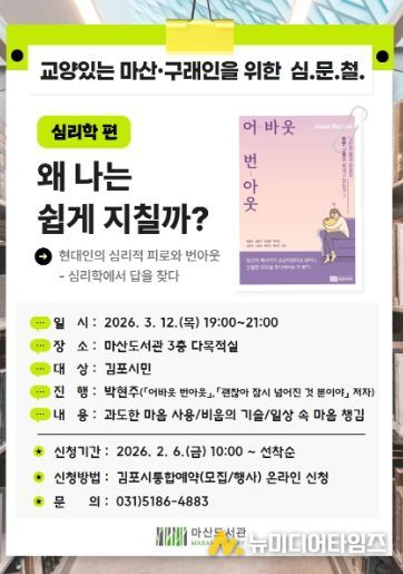 김포시 마산도서관은 심리적 피로와 번아웃을 주제로 한 인문교양 강연 '왜 나는 쉽게 지칠까?'를 오는 3월 12일 오후 7시부터 9시까지 마산도서관 3층 다목적실에서 운영한다.