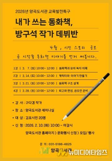 김포시 양곡도서관은 오는 3월 7일부터 3월 28일까지 매주 토요일, 시민을 대상으로 한 그림책 글쓰기 수업 '내가 쓰는 동화책, 방구석 작가 데뷔반'을 운영한다.