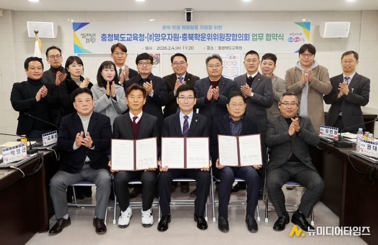 충청북도교육청은 4일, 도교육청 회의실에서 ㈜영우자원 활옥동굴, 충청북도학교운영위원회위원장협의회와 함께 '충청북도 학생 체험활동 지원을 위한 업무협약'을 체결했다.