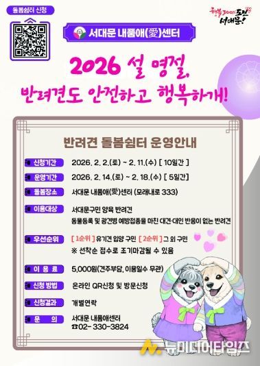 서대문구가 설 연휴 기간 반려견 돌봄에 어려움이 있는 구민들을 위해 이달 14일 토요일부터 18일 수요일까지 닷새간 서대문 내품애(愛)센터(모래내로 333)에서 반려견 돌봄 쉼터를 운영한다.