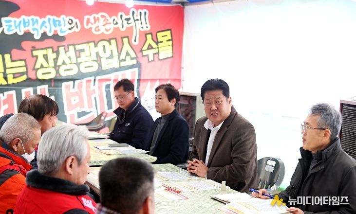이상호 태백시장은 지난 3일 장성광업소 수몰 반대 투쟁위원회 야외 투쟁 본부를 찾아 “한파에도 태백의 역사이자 대한민국 산업화의 상징인 장성광업소를 지키고자 하는 지역주민의 투쟁 현실에 마음이 매우 무겁다”며 “지역주민의 의견이 최우선인 만큼 지속적으로 소통하며 의견을 따르겠다”고 밝혔다.