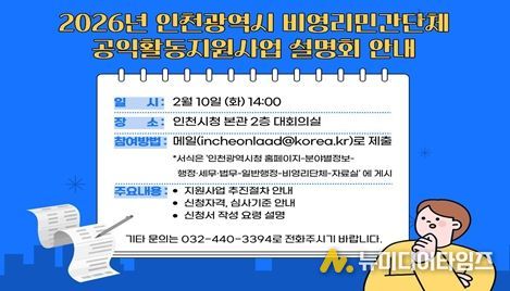 인천광역시는 비영리민간단체의 공익활동을 활성화하고 원활한 사업 참여를 지원하기 위해 '2026년 인천광역시 비영리민간단체 공익활동 지원사업 설명회'를 오는 2월 10일 개최한다고 밝혔다.