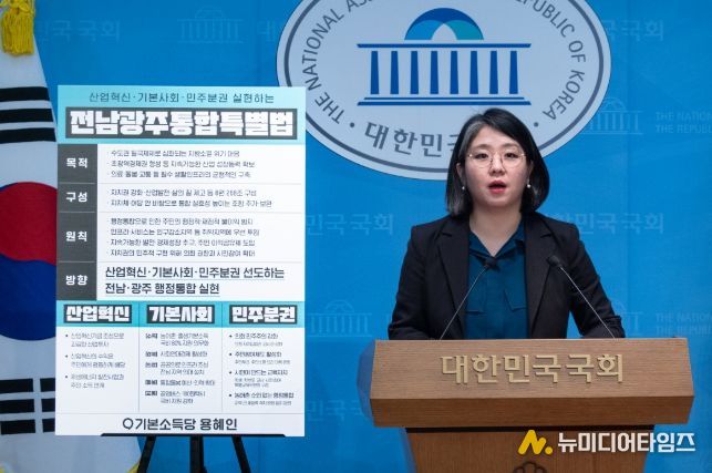 용혜인 기본소득당 의원이 4일 오전 11시40분 국회 소통관에서 기자회견을 열고 전남광주특별시 설치를 위한 특별법을 당론으로 대표발의한다고 밝혔다. 용 의원은 ”책임지는 야당답게 5극 3특 국가균형성장의 국정과제를 뒷받침하고, 산업혁신·기본사회·민주분권 선도로 전남·광주 도약을 힘차게 견인하는 쇄빙선으로 나서겠다“고 강조했다.
