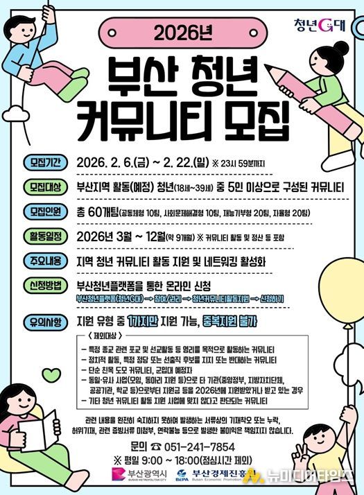 부산시는 오늘(6일)부터 2월 22일까지 '2026년 청년 커뮤니티 활동 지원 사업' 참여팀을 모집한다고 밝혔다.