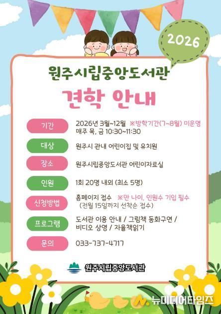 원주시립중앙도서관은 오는 3월부터 12월까지 관내 유치원과 어린이집을 대상으로 도서관 견학 프로그램을 운영한다.