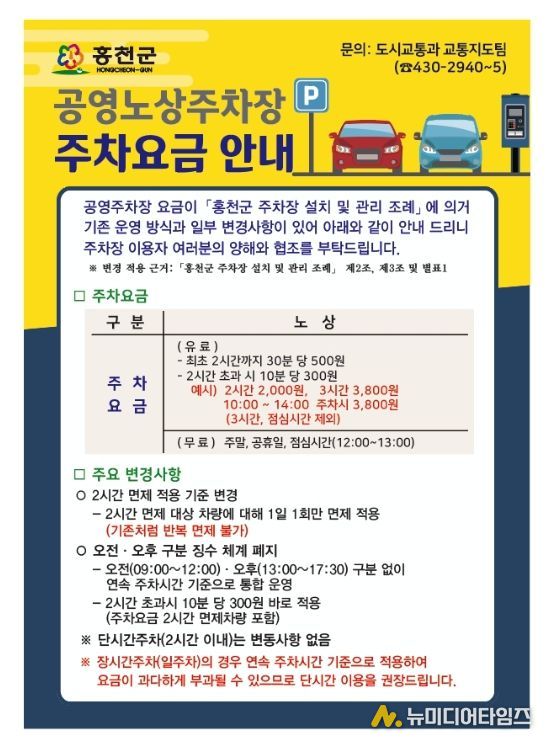 홍천군은 공영 노상주차장 주차 관제시스템을 새롭게 도입하고, 2026년 2월부터 공영 노상주차장의 주차 요금 ‘부과 시간 산정 방식’을 변경해 시행한다고 밝혔다.
