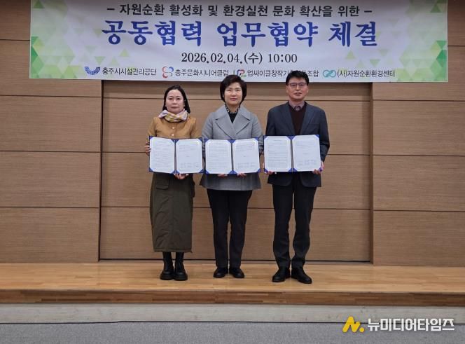 충주시시설관리공단은 지난 4일 충주문화시니어클럽, 업싸이클&자원순환 환경센터와 함께 자원순환 확대와 ESG 경영 실천을 위한 상호협력 협약을 체결했다고 밝혔다.