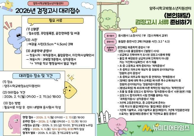 양주시학교밖청소년지원센터에서는 학교 밖 청소년들을 위해 2026년 제1회 초중고 졸업 학력 검정고시 응시 원서 접수 대행을 지원한다.
