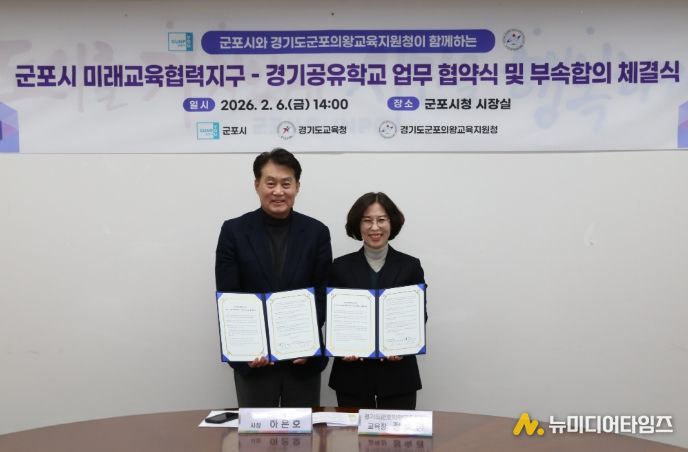 군포의왕교육지원청과 군포시청은 2월 6일 군포시청에서 '2026 군포시 미래교육협력지구-경기공유학교 업무협약식 및 부속합의서'를 체결했다.