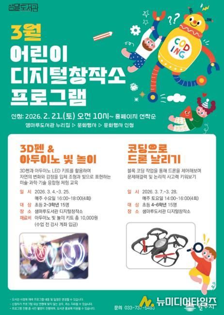원주시 샘마루도서관은 오는 3월부터 관내 어린이를 대상으로 상반기 어린이 디지털창작소 프로그램을 운영한다.