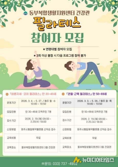바른자세·코어 필라테스는 3월 4일부터 5월 27일까지 매주 월·수요일에, 관절·근력 필라테스는 3월 3일부터 5월 26일까지 매주 화·목요일에 총 24회에 걸쳐 진행된다. 각 과정은 해당일 오전 10시부터 50분간 센터 2층 건강관에서 소규모 인원으로 운영되며, 수강료는 무료다.