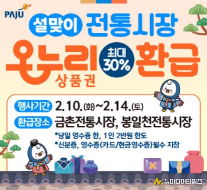 파주시는 2026년 설 명절을 맞아 고물가로 인한 시민들의 가계 부담을 덜고 지역 전통시장 활성화를 도모하기 위해 ‘설맞이 농축산물 온누리상품권 환급 행사’를 실시한다.
