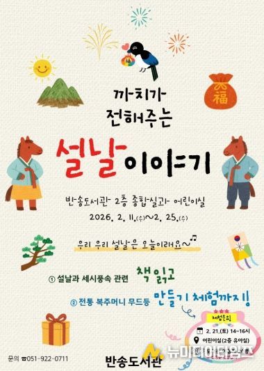 부산광역시립반송도서관(관장 박미양)은 우리나라 대표 전통 명절 설날을 맞아 사학특성화 프로그램 ‘까치가 전해주는 설날 이야기’를 오는 11일부터 25일까지 운영한다.