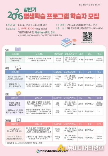 인천광역시교육청계양도서관은 학생과 지역주민에게 다양한 배움과 자기계발의 기회를 제공하기 위하여 오는 19일부터 ‘2026년 상반기 평생학습 프로그램’학습자를 모집한다.