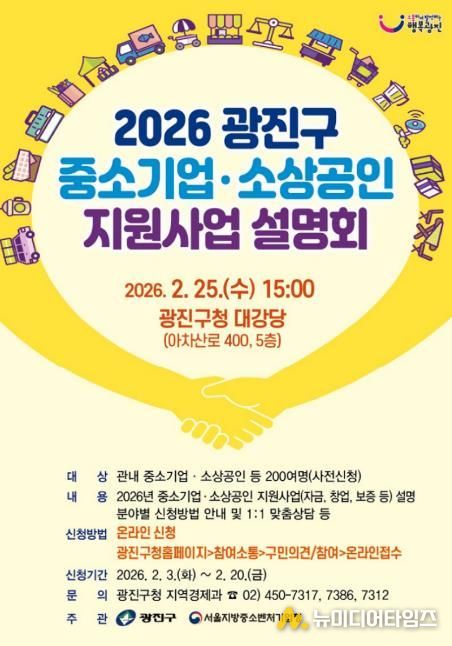 광진구가 2월 25일 광진구청 대강당에서 서울지방중소벤처기업청과 함께 ‘2026 광진구 중소기업‧소상공인 지원사업 설명회’를 개최한다.