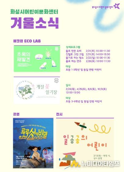 화성시어린이문화센터는 새해를 맞아 지역 생태환경을 주제로 한 특별 교육 프로그램‘에코랩(Eco Lab)’을 운영한다고 9일 밝혔다.