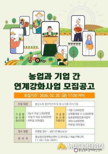 (재)충남창조경제혁신센터는 ‘2026년 농업과 기업 간 연계강화 지원사업’ 참여 대상을 모집한다고 밝혔다.