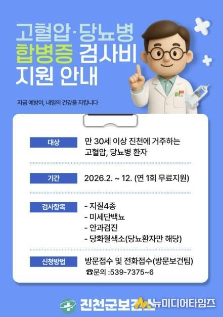 충북 진천군은 고혈압과 당뇨병 질환자의 합병증을 조기에 발견하고 체계적인 건강관리를 돕기 위해‘2026년 고혈압·당뇨병 합병증 검진 사업’을 실시한다고 11일 밝혔다.