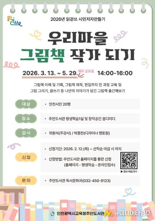 인천광역시교육청주안도서관은 읽걷쓰 시민저자 양성을 위한 ‘우리마을 그림책 작가 되기’ 프로그램 참여자를 모집한다.