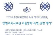 춘천교육문화관(관장 유선종)은 2026년 1월 27일부터 2월 6일까지 겨울방학을 맞아 학생, 학부모, 지역주민이 함께 참여할 수 있는 ‘강원교육사료관 특별 개관’ 행사를 운영한다. 이번 행사는 ‘춘천교육문화관 속 또 하나의 박물관’인 강원교육사료관을 겨울방학 기간 동안 한시적으로 개방하는 프로그램으로, 운영 시간은 오후 2시부터 오후 5시까지이다. 특히 이번 특별 개관 기간에는 독서이벤트를 함께 진행한다. 강원교육사료관을 관람한 이용자가 어린이자료실 또는 제1·2자료실에서 도서 1권 이상을 대출할 경우 소정의 학습용품을 증정해, 추운 겨울날 교육문화관에서 독서와 문화 체험을 동시에 즐길 수 있도록 했다. 유선종 관장은 “지난 여름방학에 이어 두 번째로 마련된 이번 특별 개관이 지역 주민들에게 강원교육의 역사를 배우고 독서의 즐거움도 함께 누리는 소중한 시간이 되길 바란다”며, “앞으로도 다채로운 행사를 기획해 강원교육사료관이 주민과 늘 함께하는 친숙한 문화공간이 되도록 노력하겠다”고 말했다. 행사에 대한 자세한 사항은 춘천교육문화관 누리집을 참고하거나 문헌정보과로 문의하면 된다.