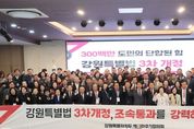 강원특별자치도 범국민추진협의회(협의회장 최양희, 추진단장 김천수)가 11월 21일 11시, 춘천 스카이컨벤션 2층 컨벤션홀에서 강원특별법 3차개정 조속 통과 촉구 결의대회를 개최했다. 당초 정기총회를 개최할 예정이었으나 어제(11월 20일) 국회 행정안전위원회 법안소위에서 강원특별법 3차 개정이 논의가 불발되자 긴급 행동에 나섰다. 이날 결의대회에는 범추협 위원들을 비롯해 고문직을 맡고 있는 김진태 도지사, 김시성 도의회 의장 등 200여 명이 참석하여 조속 통과를 촉구하는 목소리를 높였다. 최양희 협의회장은 “오늘은 강원특별자치도의 성과를 함께 축하하는 날이 돼야 했지만, 어제 행안위에서 3차 개정을 또 미루는 바람에 오히려 우리의 결의를 더 크게 보여줘야 하는 날이 됐다”라며, “각 지역에서 올라오신 위원 여러분의 지혜와 네트워크가 어느 때보다 절실하다”라고 말했다. 김진태 강원특별자치도지사는 “3차 개정안이 처음 국회에 올라간 게 작년 9월인데, 1년이 넘도록 단 한 번도 심사를 하지 않았다”라며, “5극 3특을 강조하면서 특별자치도 법은 시간이 없다고 국회 심사가 미뤄지는 것이 현실이다. 강원도의