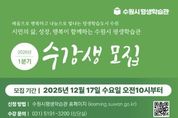 수원시평생학습관이 12월 17일 오전 10시부터 2026년 1분기 수강생을 모집한다. 1월부터 3월까지 운영되는 1분기 강좌는 ▲첨단미래기술 프로그램 ▲디지털 지식정보 프로그램 ▲생활문화 프로그램 ▲교양 프로그램 ▲인문 프로그램 ▲기관 협력 재능기부 프로그램 ▲거북이공방 프로그램 ▲대상별 맞춤프로그램 ▲시민교육 프로그램 ▲언제든학교 시민기획 프로그램 ▲무지한스승의만남 시민참여기획 프로그램 등 총 11개 과정, 115개 세부 강좌로 구성됐다. 첨단미래 기술 프로그램을 강화했다. 인공지능(AI) 기술에 초점을 둔 첨단미래기술 프로그램, 성균관대학교 지능로봇리빙랩과의 협업을 통한 자율주행 실습, 가상현실(VR)드론 시뮬레이션 체험 등이 있다. 또 글쓰기, 사주명리학, 한글 서예, 현대미술, 명화감상, 뮤지컬 등을 주제로 한 교양 프로그램과 중장년, 시니어, 제2의 인생설계, 청소년 등을 대상으로 하는 대상별 맞춤 프로그램을 마련했다. 수원시는 새빛톡톡 시민 설문조사를 활용해 2026년 강사를 공개 모집했고, ▲생활문화 프로그램 ▲디지털 지식정보 프로그램 ▲대상별 맞춤프로그램 ▲첨단미래기술 프로그램 ▲교
