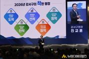 진교훈 서울 강서구청장이 14일 “지역의 수많은 현안들을 하나하나 해결하면서 구민의 삶에 착! 다가가는 구정을 펼치겠다”고 강조했다. 진 구청장은 이날 오후 코엑스 마곡에서 열린 ‘2026년 신년인사회’에서 올해는 도전과 혁신으로 구민과 함께 성장하는 도약의 해가 될 것”이라며 이같이 말했다. 진 구청장은 ▲균형발전 도시에 도착 ▲안전‧안심 생활에 안착 ▲미래경제 도시에 선착 ▲복지‧건강 구민 곁에 밀착 ▲교육‧문화 일상에 정착 등 5가지 핵심전략을 제시하며 “구민이 일상에서 체감할 수 있는 착한 행정을 펼쳐나가겠다”고 재차 강조했다. 가장 먼저 제시한 과제는 고도제한 완화 신속 이행과 주거 환경 개선이다. 그는 ”고도제한 완화를 위한 밑그림은 그려졌지만 조기 시행과 강서구에 최적의 방안이 적용될 수 있도록 끊임없이 노력하겠다“며 ”지역 곳곳에서 추진 중인 재개발·재건축 등 정비사업들도 차질 없이 추진해 나가겠다“고 말했다. 또한, 대장홍대선 31년 개통, 강북횡단선 재추진 등을 통해 교통 인프라를 확충하겠다는 구상도 밝혔다. 이어 폭우, 폭설 등 자연재난 대비 대응체계를