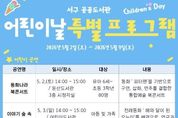 대전 서구 갈마·가수원·둔산·월평·어린이도서관은 내달 2일부터‘어린이날 특별 프로그램’을 운영한다. 이번 프로그램은 문화예술 공연과 체험 활동을 함께 즐길 수 있도록 구성된 독서 문화 프로그램으로, 온 가족이 도서관에서 다채로운 문화 경험을 할 수 있도록 마련됐다. 공연 프로그램으로는 △동화나라 북콘서트(둔산도서관) △이야기 숲 속 음악극(어린이도서관)이 운영된다. 그림책을 바탕으로 이야기와 음악, 연기가 어우러진 공연을 통해 어린이들에게 흥미롭고 몰입감 있는 문화예술 경험을 제공할 예정이다. 체험 프로그램은 양말목을 활용한‘나만의 도서 대출 카드 지갑 만들기’ 업사이클링 활동이 있다. 재활용 소재를 활용해 자신만의 개성 있는 도서 대출 카드 지갑을 만들며 환경 보호의 중요성을 배울 수 있다.