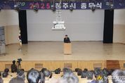 청주시는 31일 문화제조창 5층 한국공예관 공연장에서 ‘2025년 종무식’을 개최했다. 행사에는 이범석 청주시장을 비롯한 시 공직자 300여명이 참석했다. 종무식은 한 해 시정성과를 공유하고 유공 공무원과 부서를 격려하며 2025년을 뜻깊게 마무리하는 자리로 마련됐으며 국민의례, 2025년 주요 성과를 담은 영상 상영, 유공자 표창 수여, 시장 송년사 순으로 진행됐다. 특히 이날 표창 수여식에서는 국무총리, 경제부총리, 국가데이터처장, 행정안전부장관, 충청북도지사 표창을 비롯해 시정 유공 공무원, 모범공무원, 우수부서, 친절공무원 등 총 59명(개인·부서)이 수상의 영예를 안았다. 수상자들은 제안 활성화, 통계 업무 진흥, 재난관리, 에너지·주택행정, 지역경제 활성화, 시정 홍보, 복지·환경·보건 등 다양한 분야에서 시정 발전에 기여한 공로를 인정받았다. 한편 이범석 시장은 종무식 참석에 앞서 본청 소속 51개 부서를 순회하면서 직원들과 일일이 악수를 나누며 한해의 노고를 격려했다. 이범석 청주시장은 송년사에서 “2025년은 많은 도전과 변화 속에서도 시민과 공직자가 흔들림 없이 힘을