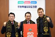 강원특별자치도의회는 2026년 강원FC의 선전과 도내 축구 열기 확산을 위해 ‘시즌권 구매-기부 릴레이’에 동참한다. 강원특별자치도의회 의장 김시성과 김병지 강원FC 대표이사는 1월 14일 도의회 의장 집무실에서 강원FC 시즌권 구매-기부 릴레이를 진행했다. 이번 릴레이를 통해 강원특별자치도의회 명의로 기부된 시즌권은 평소 프로축구를 접하기 어려운 아동과 청소년에게 전달되어 도민 화합과 축구 저변확대에 기여할 것으로 기대된다. 도의회 김시성 의장은 “올 한해도 강원FC가 한 단계 더 도약하고 성장할수 있도록 지속적인 관심을 기울이겠다”며, “강원FC가 도민들에게 화합과 행복을 주는 구단으로 발전하기를 응원한다”고 말했다.
