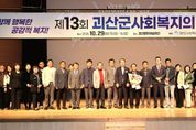 충북 괴산군은 29일 괴산군 문화예술회관에서 ‘제13회 괴산군 사회복지의 날 기념행사’를 개최했다고 밝혔다. 이번 행사는 괴산군사회복지협의회(회장 고명성) 주관으로 열렸으며, 송인헌 괴산군수를 비롯한 사회복지시설 종사자 등 200여 명이 참석한 가운데 사회복지인의 노고를 격려하고 화합을 다지는 자리로 마련됐다. 행사는 장연지역아동센터 합창단의 식전공연을 시작으로, 괴산군사회복지협의회 회장 이·취임식, 유공자 표창, 인사말, 퍼포먼스 순으로 진행됐다. 이날 이·취임식에서는 최은묵 전 회장에 이어 고명성 신임 회장이 취임했으며, 유공자 표창 수여식에서는 지역 사회복지 증진에 기여한 12명이 표창을 받았다. △군수 표창은 배기만(괴산지역자활센터), 이정자(성제노의집), 심서경(괴산재가복지센터), 이충정(괴산군노인복지관), 안미경(청천재활원), 천병주(수달지역아동센터), 이봉우(햇살재가복지센터), 이정민(괴산군 가족행복과) 등 8명이 수상했다. △군의장 표창은 신미경(괴산지역자활센터), 이만형(청천재활원) 등 2명, △괴산군사회복지협의회장 표창은 조경옥(청주사랑나눔기초푸드뱅크), 심창용(괴산군