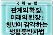 6 3 지방선거를 앞두고 다양한 청년정책이 발표되는 가운데, 청년 당사자가 직접 청년정책으로서 생활동반자법의 의미와 필요성을 조망하는 국회포럼이 개최된다. 이날 포럼에는 50여 명의 청년 당사자가 참석해 생활동반자법에 대한 의견을 나눌 예정이다. 기본소득당 용혜인 의원과 기본소득당 청년 대학생위원회는 4월 5일 오후 2시 국회의원회관 제3세미나실에서 '관계의 확장, 미래의 확장 : 청년이 감각하는 생활동반자법' 국회포럼을 개최한다. 용혜인 의원은 지난 1월 세상을 바꾸는 청년 캠페이너를 양성하는 ‘링크로스 아카데미’ 3기를 개최하고, 우수 참가자를 대학생특보로 위촉했다. 이번 국회포럼은 대학생특보가 청년 당사자로서 청년에게 필요한 제도 변화를 모색하며, 직접 포럼 기획과 진행을 맡았다. 이번 포럼에서는 용혜인 의원이 직접 위촉한 대학생특보 6인(김다희, 김서현, 나하은, 오채은, 이루리, 한빛나)이 여는 발제를 맡아, 청년의 삶에서 생활동반자법이 가지는 의미를 설명한다. 토론으로는 은둔고립청년 자조모임센터 '두더집' 운영자인 김예림 씨즈 전문위원, 이호림 무지개행동 공동대표, 변수정 한국보건사회연