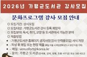 가평군도서관은 2026년 도서관 문화프로그램을 운영할 강사를 공개 모집한다고 11일 밝혔다. 모집 대상은 가평군도서관 문화프로그램 운영을 희망하는 강사로 거주지 제한은 없으나 가평군 거주자 또는 인근 지역의 강사를 우선 모집한다. 모집 분야는 유아부터 성인을 대상으로 하는 독서문화 프로그램을 비롯해 취미, 교양, 체험 등 도서관에서 운영 가능한 분야이다. 모집 기간은 올해 12월부터 상시 모집하고 있으며 제출서류를 준비해 가평군 도서관 4개소(한석봉, 설악, 청평, 조종)에 방문 또는 가평군도서관 홈페이지 공지사항에 기재된 이메일로 제출하면 된다. 제출된 서류는 가평군도서관 강사인력풀에 등록 및 관리되며, 추후 도서관 문화 프로그램 운영을 위한 강사로 활동할 수 있다. 기타 자세한 내용은 가평군도서관 홈페이지 공지사항을 참고하거나 가평군도서관으로 문의하면 안내받을 수 있다. 도서관 관계자는 “이번 공개 모집을 통해 유능하고 열정 있는 강사를 모집해 지역 주민에게 다양하고 유익한 프로그램이 운영될 수 있도록 최선의 노력을 하겠다”고 밝혔다.