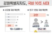 강원특별자치도는 국비 확보 10조 시대에 진입한 가운데, 인구 1인당 국비 확보액이 약 680만 원으로 전국 1위에 해당한다고 밝혔다. 2026년도 강원특별자치도 국비 확보액은 총 10조 2,600억 원으로 경기, 경북, 충남, 경남에 이어 전국 시도 중 5위에 해당한다. - 이는 도보다 인구가 2배 이상 많은 인천(6조 4,000억 원)과 부산(10조 2,000억 원)보다 많은 수치이다. 특히 국비 총액을 인구수로 환산한 인구 1인당 국비 확보액은 약 680만 원으로 전국 평균 413만 원을 크게 웃도는 수치다. 도는 이번 국비 확보 성과가 정부 차원에서 도가 추진 중인 주요 사업의 필요성과 중요성에 대한 공감한 결과로 보고 있다. 도는 앞으로 국비가 단순한 규모에 그치지 않도록 사업 추진의 완성도와 체감 성과를 높이는 데 행정력을 집중할 계획이다. 김진태 지사는 “국비 10조 원이 체감되기 어려울 수 있지만 총 규모로는 전국 기준 5위, 도민 1인당으로 환산하면 약 680만 원으로 전국 1위에 해당한다”며, “확보된 국비가 현장에서 차질없이 집행돼 도민이 체감할 수 있는