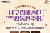 부산 남구는 오는 11월 2일 오후 17시 부산문화회관 대극장에서‘남구립예술단 합동 연주회 Together, We Sing’을 개최한다. 남구립예술단은 ▲소년소녀합창단(지휘 김주곤) ▲오륙도여성합창단(지휘 곽기웅) ▲욜드합창단(지휘 고영호)으로 구성되어 있으며, 남구를 대표하는 문화사절단으로 활발히 활동하고 있다. 이번 연주회는 남구청 개청 50주년을 기념하여 세 합창단이 처음으로 함께하는 합동 연주회라는 점에서 특별한 의미를 지닌다, 각 합창단의 개성과 감성을 담은 다채로운 무대를 통해 관객에게 풍성한 음악적 경험을 선사할 것으로 기대된다. 소년소녀합창단은 맑고 순수한 목소리로 음악극‘푸른 하늘 은하수’를 선보이고, 오륙도여성합창단은 ‘그리움 그리고 사랑’이라는 테마로 세대를 이어주는 따뜻한 감성의 하모니를 들려주며, 욜드합창단은 인생의 깊이와 여운이 느껴지는 ‘행복한 인생’이라는 감동의 무대를 마련했다. 특히 이번 공연의 하이라이트는 세 합창단이 함께 꾸미는 합동무대다. 서로 다른 세대의 목소리가 한 무대에서 하나의 선율로 어우러지며, 노래를 통해 마음을 나누고 세대를 잇는 특별한 순간을 선사